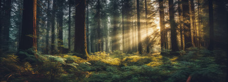 Panoramic view of foggy forest with sunbeams through trees