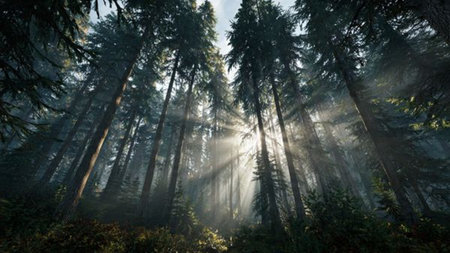 Sunlight breaks through tall trees in a misty forest, creating a serene atmosphere at early morning.