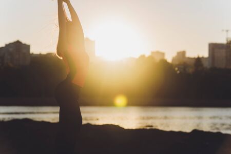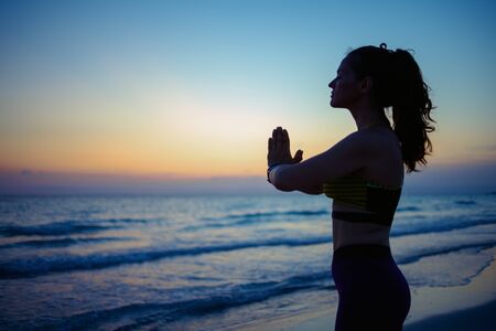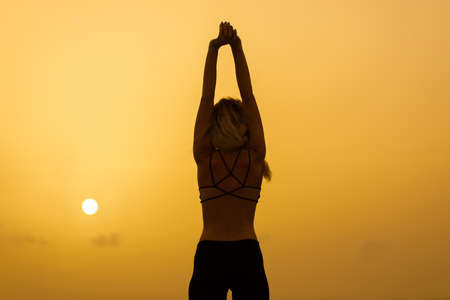 Silhouette of young woman in fitness clothes on the seacoast in the evening doing yoga.