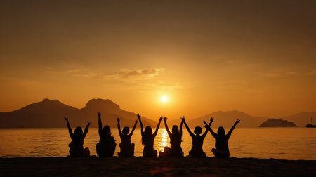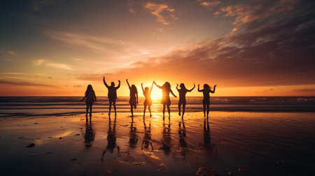 Photograph of group silhouette jumping up on the beach, golden hour, AI Generated.