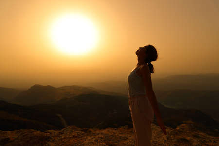 Profile of a woman silhouette breathing fresh air in the mountain at sunset