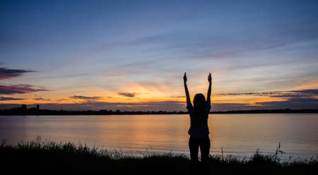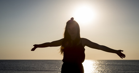 Silhouette of young woman standing at relax pose or freedom pose or chill pose on the beach during sunset.