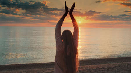 Back view of woman with long hair walking to the sea and raising her hands up. Looking on sunset.