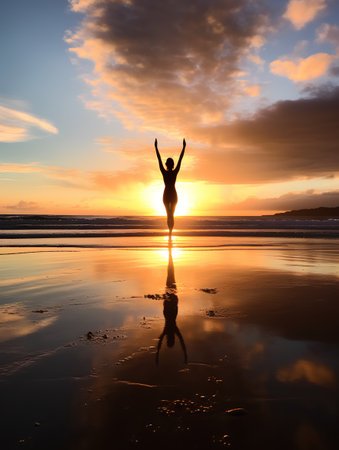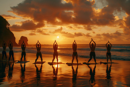 Tranquil scene of individuals practicing yoga poses on a beach, silhouetted against a dramatic sunset over the ocean