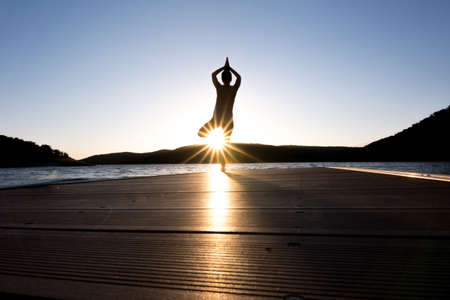 young girl doing yoga poses on a pier at sunset. Tree pose