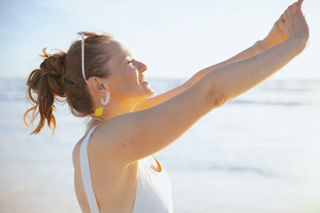 Happy woman coach standing yoga pose and making full body stretching workout on seashore at sunrise