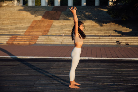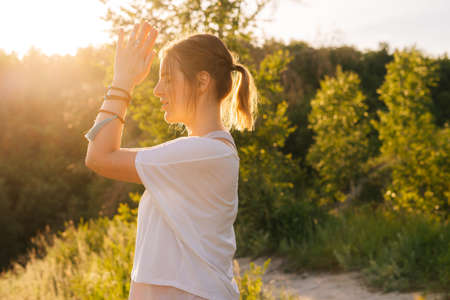 Side view of happy meditating woman raising hands in Namaste pose background of bright sun rays. Beautiful girl meditating, doing breathing exercising. Concept of practicing yoga alone outdoor.