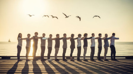 A group of individuals stands together with arms extended, against a backdrop of a tranquil ocean and sky. The composition features a warm, soft lighting, and a serene atmosphere. This image could be suitable for illustrating concepts of unity, connection, or freedom for various commercial and editorial projects.