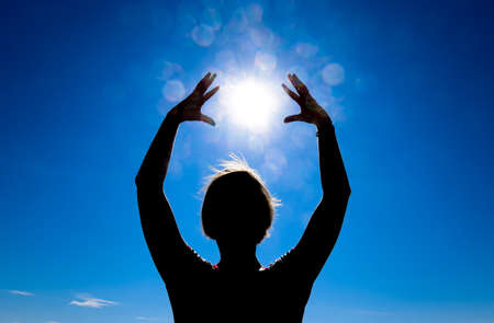 Silhouette of a girl against the background of the sun and blue sky. Hands are raised up to the sun.