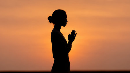 This serene silhouette of a woman praying at sunset captures a moment of reflection and inner peace, set against a backdrop of warm hues that evoke tranquility.