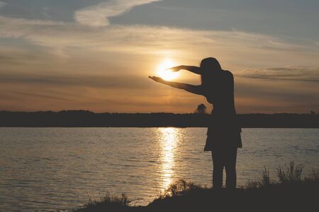 Front view of a back light of faithful woman silhouette holding sun on the beach at sunrise with a warm background
