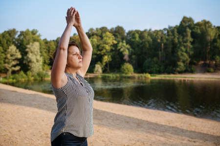 Mature woman at holiday destination beach contemplating lake sitting on shore in yoga position holding hands at sides, meditating meditating outdoors. Good happens mature sport and healthy lifestyle