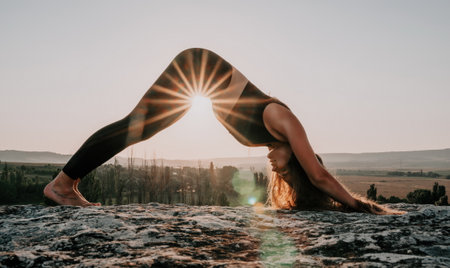 A silhouette woman stretches her arms above her head while practicing yoga as the sun sets behind her. The sky is bathed in warm colors, and the rocky terrain creates a serene backdrop.