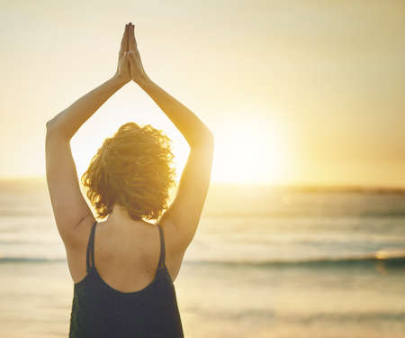 Theres something soothing about being at the sea. Rearview shot of a young woman practising yoga at the beach.