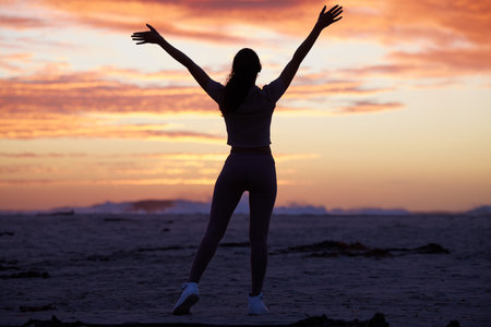 Woman, open arms and silhouette with stretch, sunset for freedom, faith and spiritual balance at beach. Celebration, wellness and peace with female person to relax or rest in nature with sea