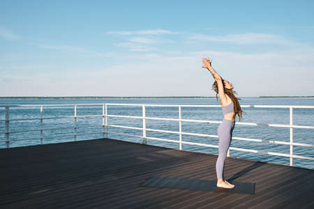 Young sportswoman stretching arms upwards during yoga exercise on pier against blue water and sky