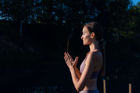 Profile of young woman relaxing on the beach, meditating with hands in Namaste gesture at sunset or sunrise, close up
