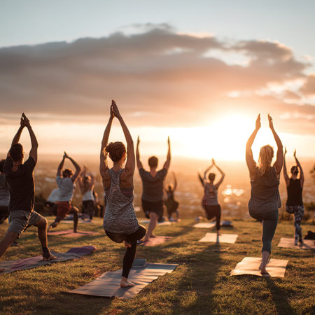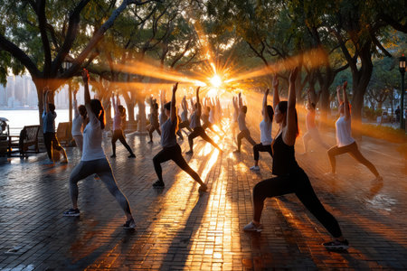 A serene yoga class at sunrise, participants in a tranquil outdoor setting, symbolizing peace and mindfulness. Resplendent.