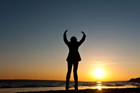Silhouette of a woman with raised arms against a sunset sky over a sea background.