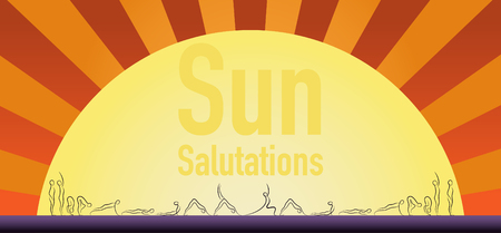 Yoga sun salutation pose step in gesture drawing line with sun on background.