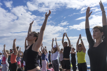 THESSALONIKI, GREECE - JUNE 21, 2015: Thessaloniki open yoga day. People gathered to perform yoga training during the day, outdoor activities