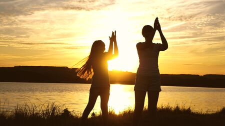 happy woman and man jumping against beautiful sunset freedom enjoyment concept Silhouette of a woman dancing against a sea background