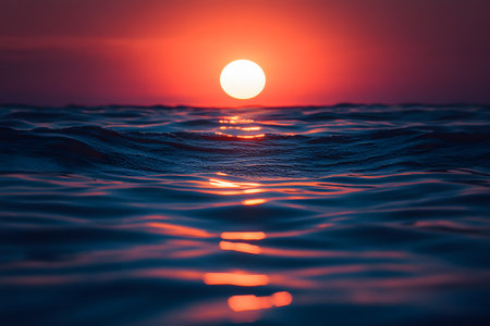 A serene sunset over the ocean highlights vibrant red and orange hues with gentle waves in the foreground. perfect for themes of tranquility, relaxation, or meditation in wall art or posters. Generative AI