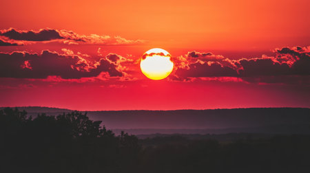 This stunning sunset showcases a warm orange glow over rolling hills, creating a tranquil atmosphere perfect for nature lovers and landscape photography enthusiasts.