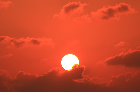 Beautiful sunset in the evening sky with red sun and clouds.