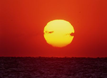 Large sun setting over horizon, casting intense orange and red hues across the sky