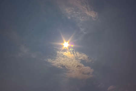 Shining sun at clear blue sky,clouds.Solar lens flare. copy space.Natural lens flare.Sunrays of bright sun on summer day.