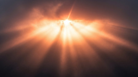 A stunning display of radiant sunshine exploding through clouds, creating beautiful light trails.