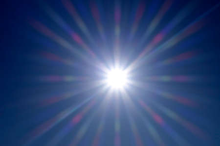sunbeams and sun in the blue sky, reklections of camera lense, no people