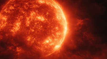 Close-up of the sun with vibrant solar flares and intense magnetic storms. Highlighting the sun's dynamic energy and its impact on space weather