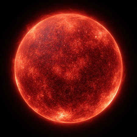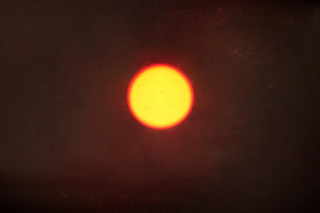 A vibrant red sun with a bright orange glow and white specks in the atmosphere