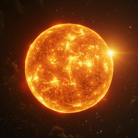 A dynamic depiction of the Sun, showcasing its incandescent surface, plasma activity, solar flares, and prominences against the vastness of space.