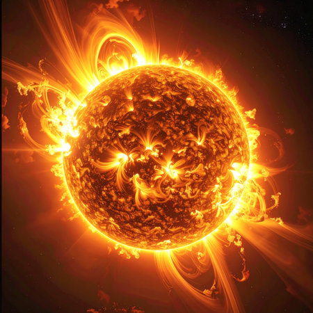Close-up of the sun with vibrant solar flares and intense magnetic storms. Highlighting the sun's dynamic energy and its impact on space weather