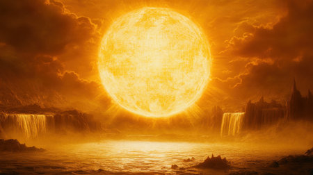 The image showcases a bright sun shining against a warm yellow sky, creating a calming and serene environment perfect for conveying peace and tranquility.