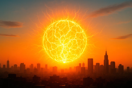 A huge electric sun over the city at sunset