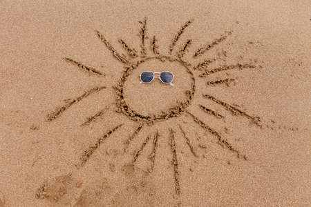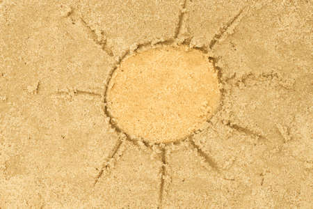 Symbol of sun drawing on sand, background for vacation. Summer background with copy space.