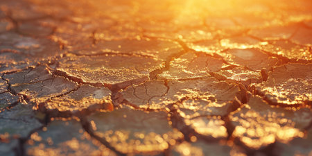 close-up of cracked and dry earth, with sun shining overhead, created with generative ai