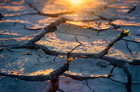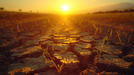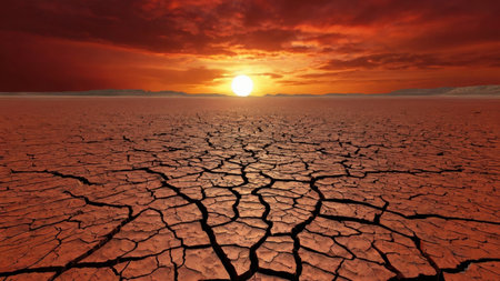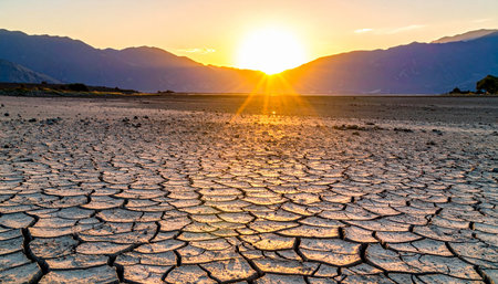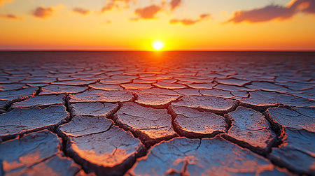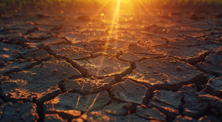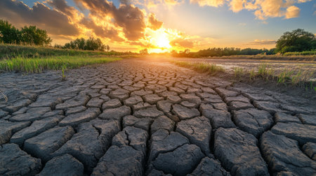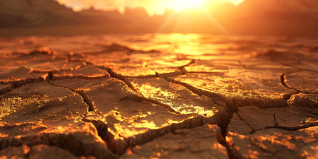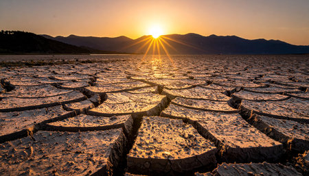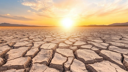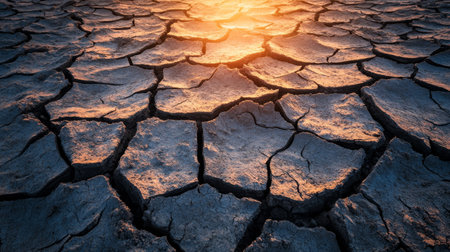 Cracked soil highlights severe drought conditions as the sun sets over a barren landscape, showing the impact of climate change on agriculture.