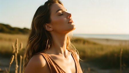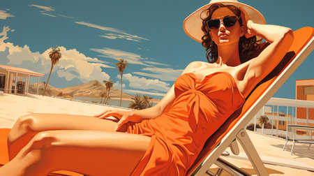 the woman, constance, lounges elegantly on the sun-kissed beach, radiating a chic aura in her vibrant orange attire, evoking the nostalgia of 1990s poolcore vibes, amidst a backdrop of sleek, hyper-detailed renderings, blending realistic and stylized elements, with warm light maroon and brown hues, in this stunning uhd image. ai generated
