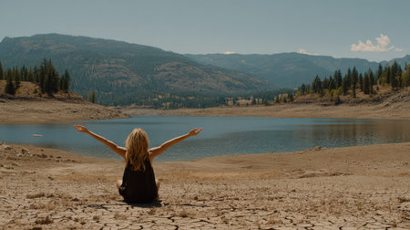 Young woman sitting on the shore of a mountain lake with her arms outstretched