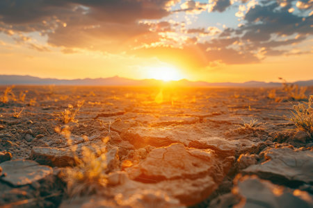 This striking image captures a golden sunset illuminating a dry, cracked ground. The warm colors of the sky reflect off the landscape, creating a serene yet dramatic scene.