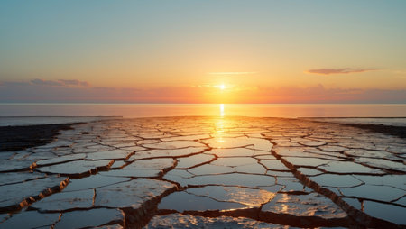 Cracked earth stretches endlessly under a radiant sun, creating a vivid depiction of environmental challenges during the evening hours.