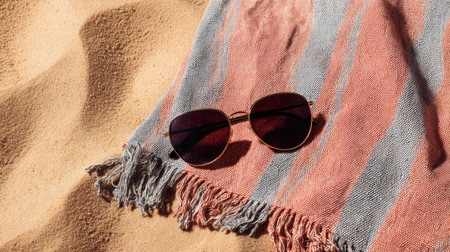 Aerial view of sunglasses on a sandy beach towel with minimal props, perfect for lifestyle product mockup