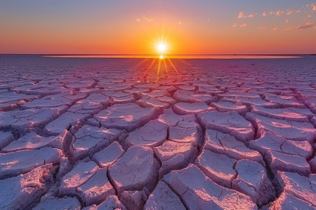 A stunning sunset illuminates the cracked earth of a desert, highlighting the intricate patterns formed by dryness.