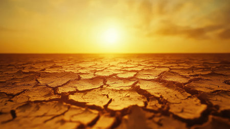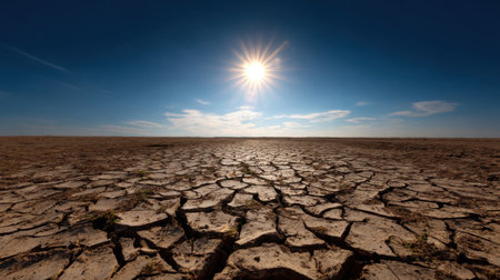A cracked, dry earth landscape under a scorching sun, symbolizing the harsh effects of drought and global warming on the environment.