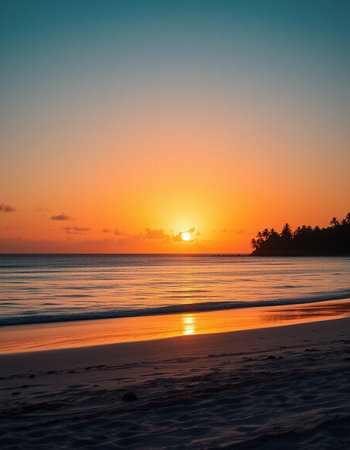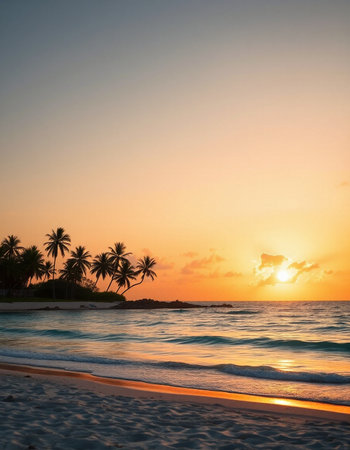 Tropical beach sunset with palm trees, serene horizon. Relaxation and travel concept